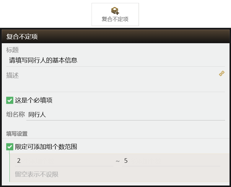 复合不定项本身可以设置标题,描述,是否必填等通用信息,此外还可以设置: