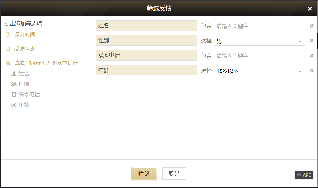 结构化筛选中,可以对复合不定项中的各个题目进行筛选条件设置,反馈中任意一组消息满足筛选条件,就会被筛选出来。