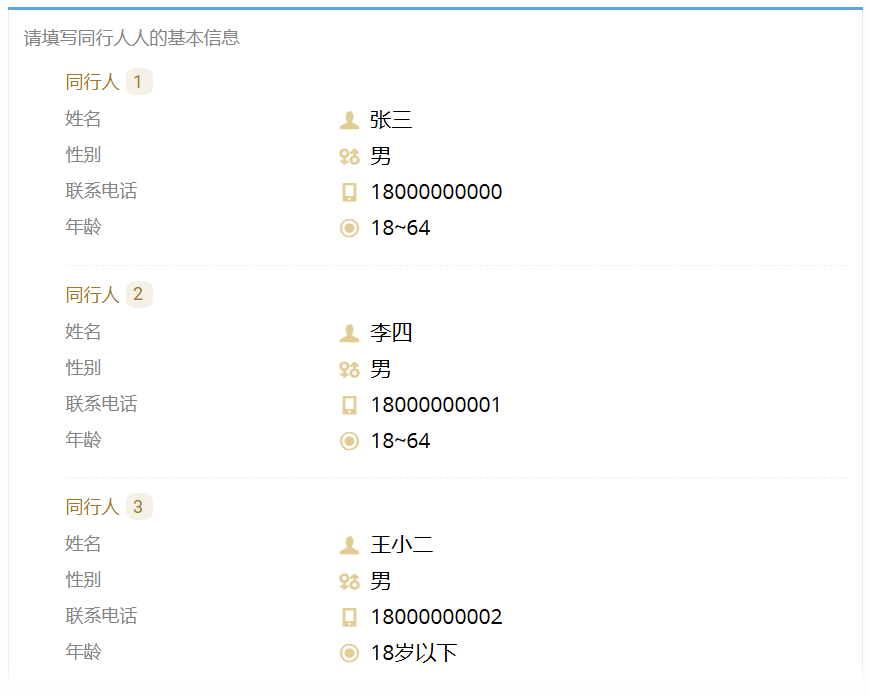 【预订酒店/参观登记】时,逐个录入所有同行人员的基本信息;