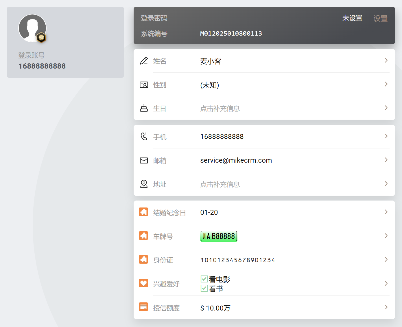 CRM(客户关系管理)的核心资产,就是联系人的信息。麦客的联系人功能中提供了比较基础和通用的联系人信息项,比如姓名、公司、住址、手机、邮箱、微信、微博等常规的个人信息。