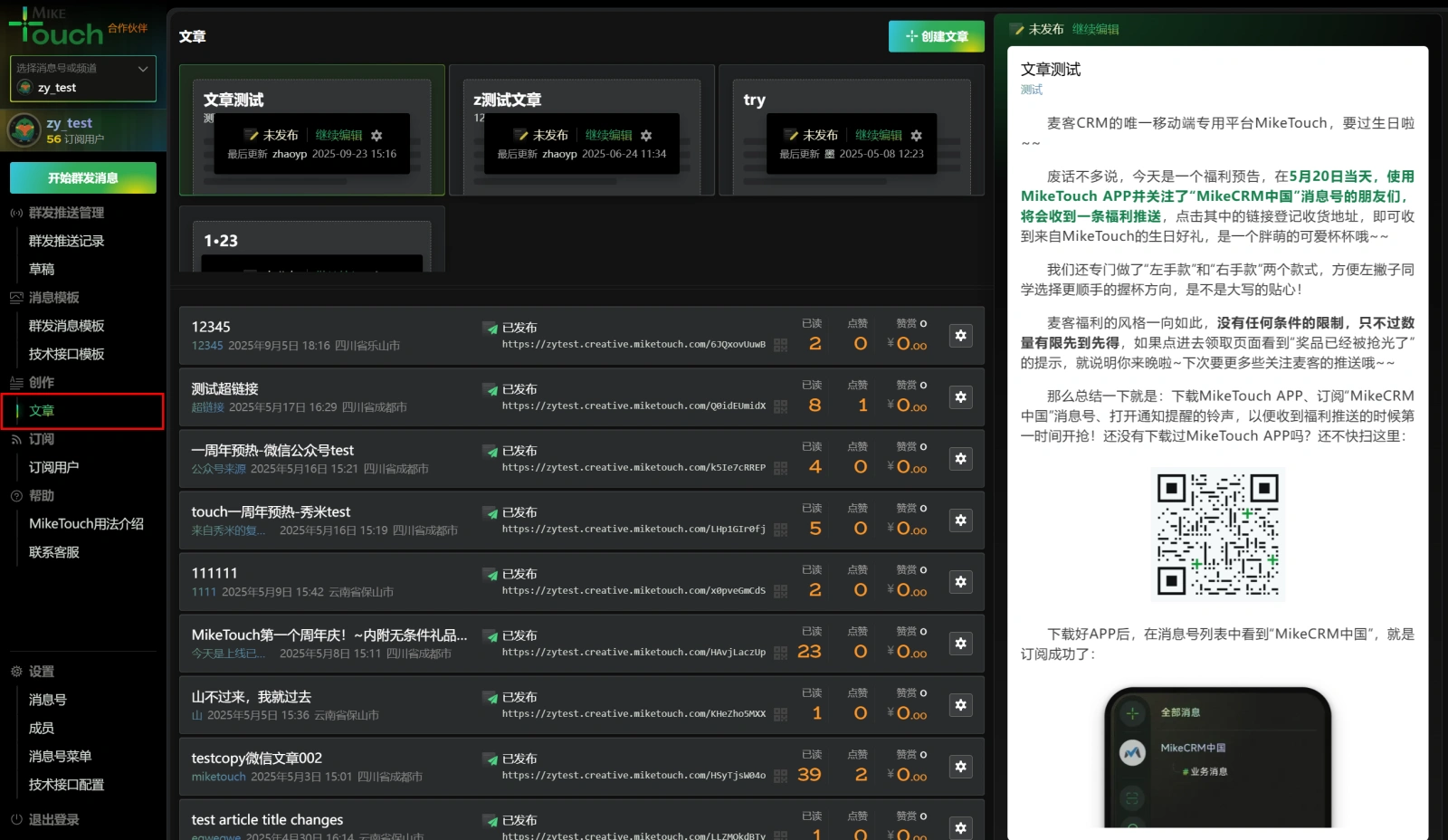 从左侧菜单“创作-文章”进入文章列表,列表上方展示未发布的文章草稿,下方展示已发布的文章列表记录,右侧展示当前选中文章的内容预览。已发布的文章,系统会统计每一篇文章的访问量,点击量等数据,还可以在列表中快速获取文章链接及对应的专属二维码图片。