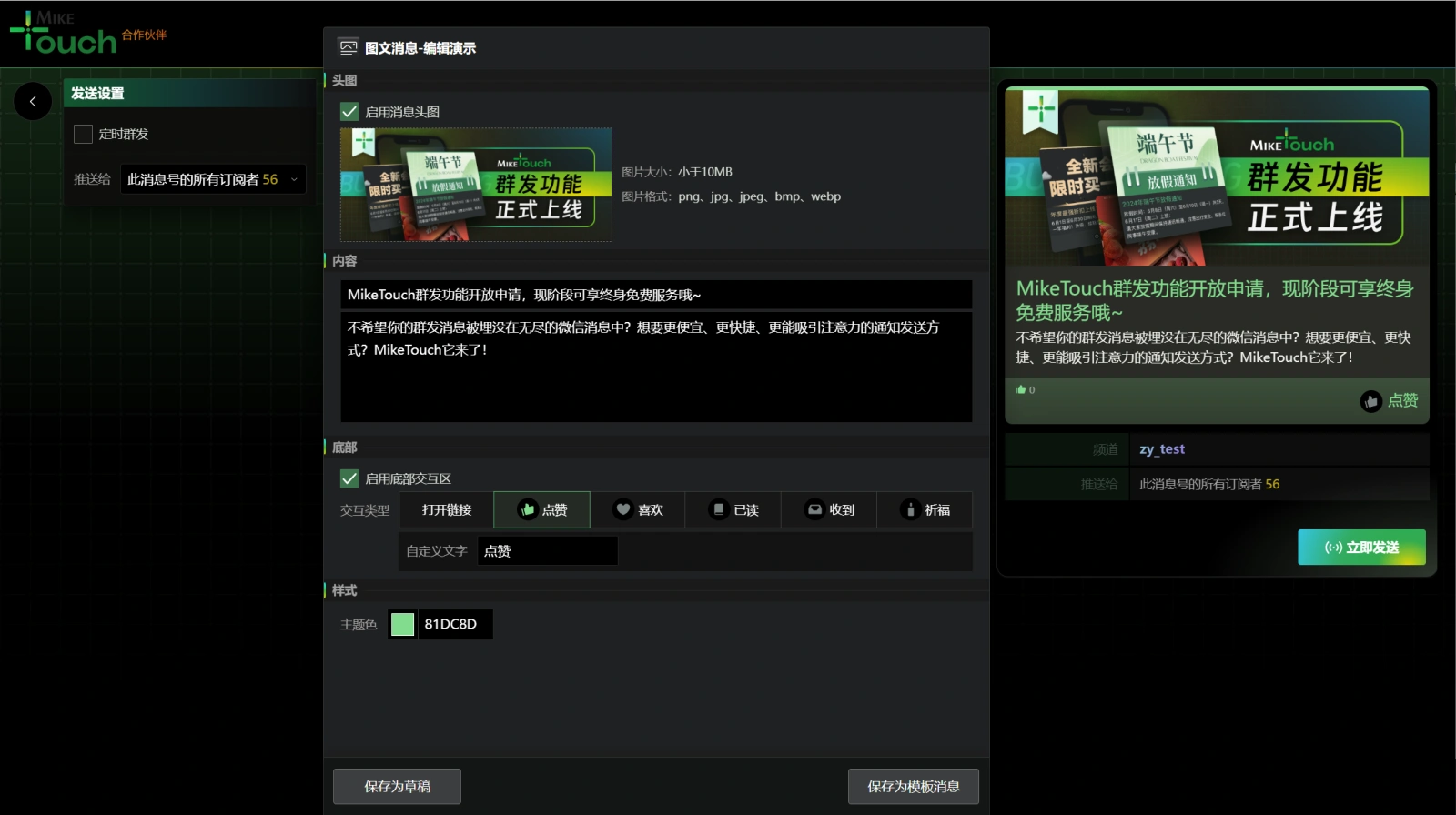 样式:调整主题色,同步调整卡片边框,标题和文字链接的颜色。MikeTouch客户端及应用为深色背景,切换颜色时注意搭配使用哦~曾经使用过的主题色,系统会在选色器上为您保留下来,以便下次推送消息时可以直接复用。