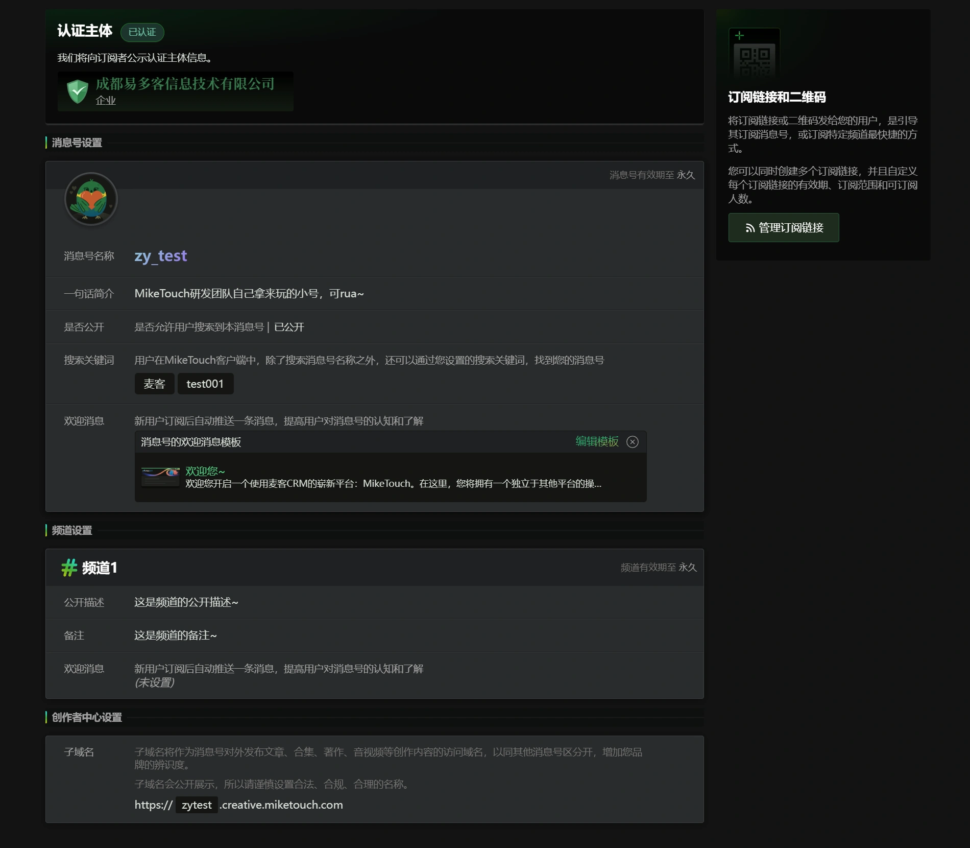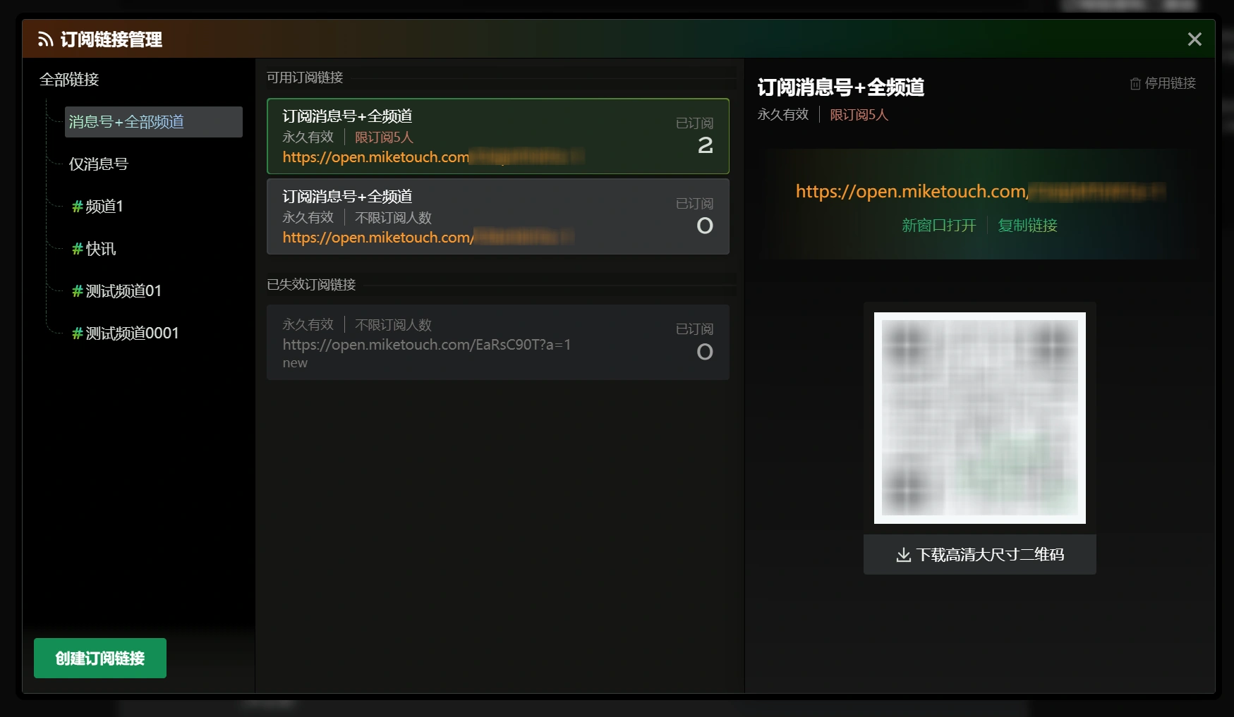 您可以在页面右上方的“订阅链接和二维码”的卡片中“管理订阅链接”,查看消息号及各个频道的订阅链接,下载对应的二维码图片。