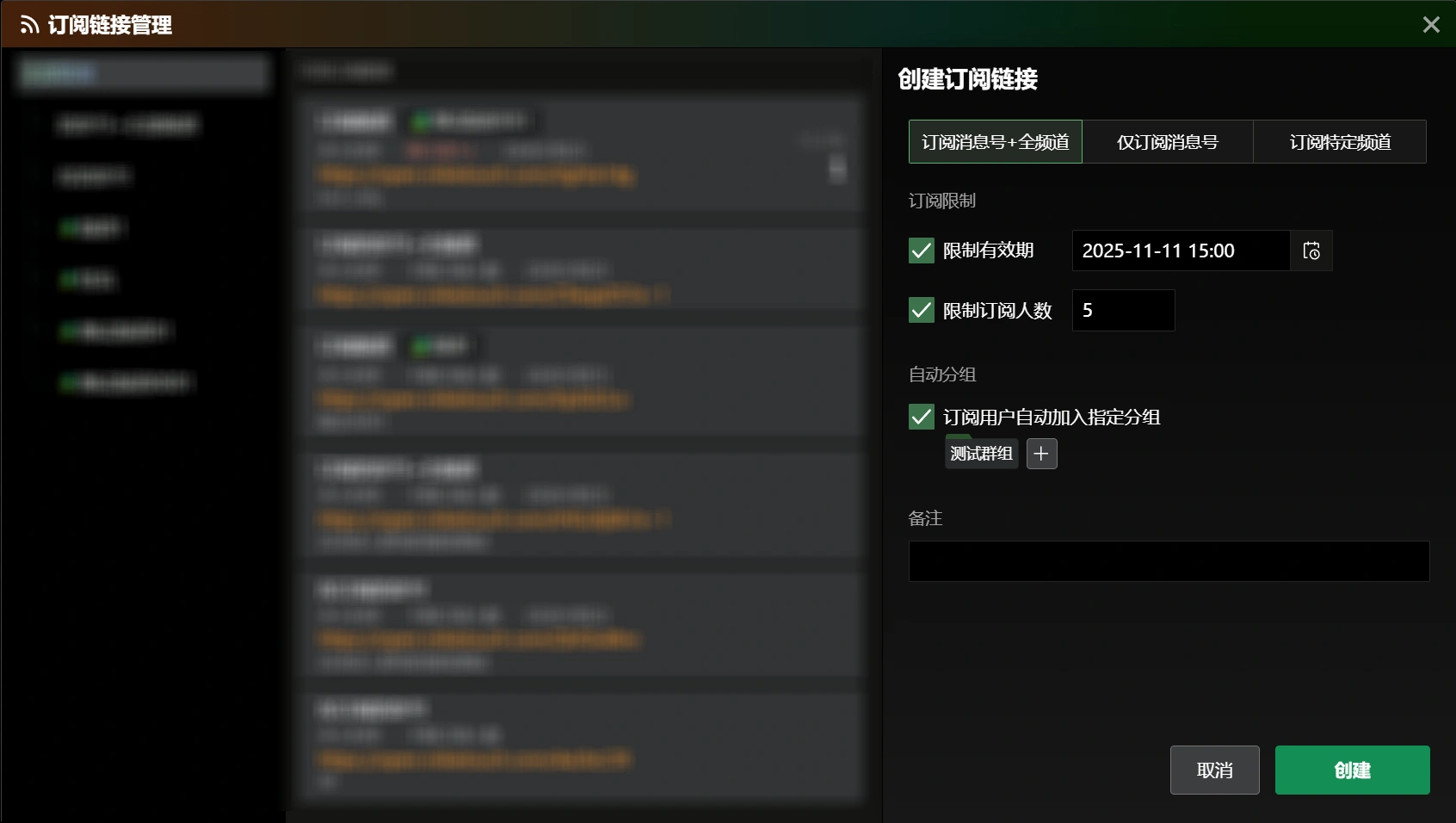 您也可以随时创建新的订阅链接,创建时可以选择订阅的频道/消息号范围,以及设置订阅链接的有效期和订阅人数上限,还能将订阅用户自动分入指定的分组中,便于后续的定位管理。这样可以创建一些临时的订阅链接,到期自动失效,或者关注人数达上限后自动失效,控制预期之外的新增订阅,避免链接“泄露”。