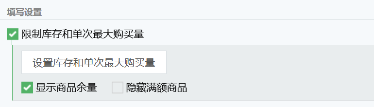 接下来是商品组件的“填写设置”,可以勾选启用设置项“限制库存和单次最大购买数量”,再点击下方“设置库存和单次最大购买量”按钮进行详细设置。