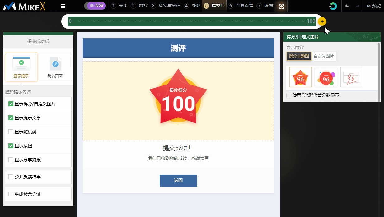 设置好测评题目的答案与分值后,表单提交后显示图片的功能会自动升级为“显示得分/自定义图片”;此功能默认开启,以便展示填表人此次作答的具体得分。