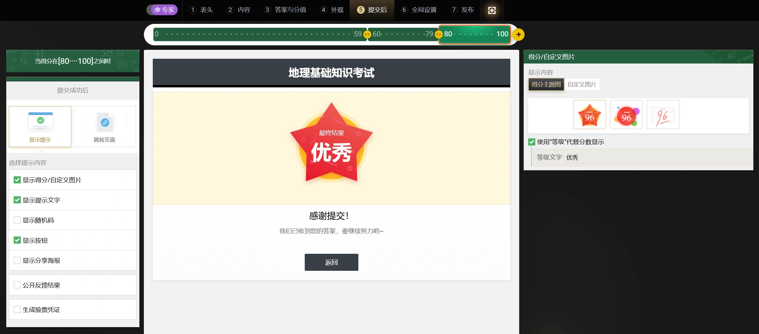 我们可以根据测评得分设置不同的表单提交后行为,80-100分的显示优秀的海报证书,60分以下的自动跳转补考链接……