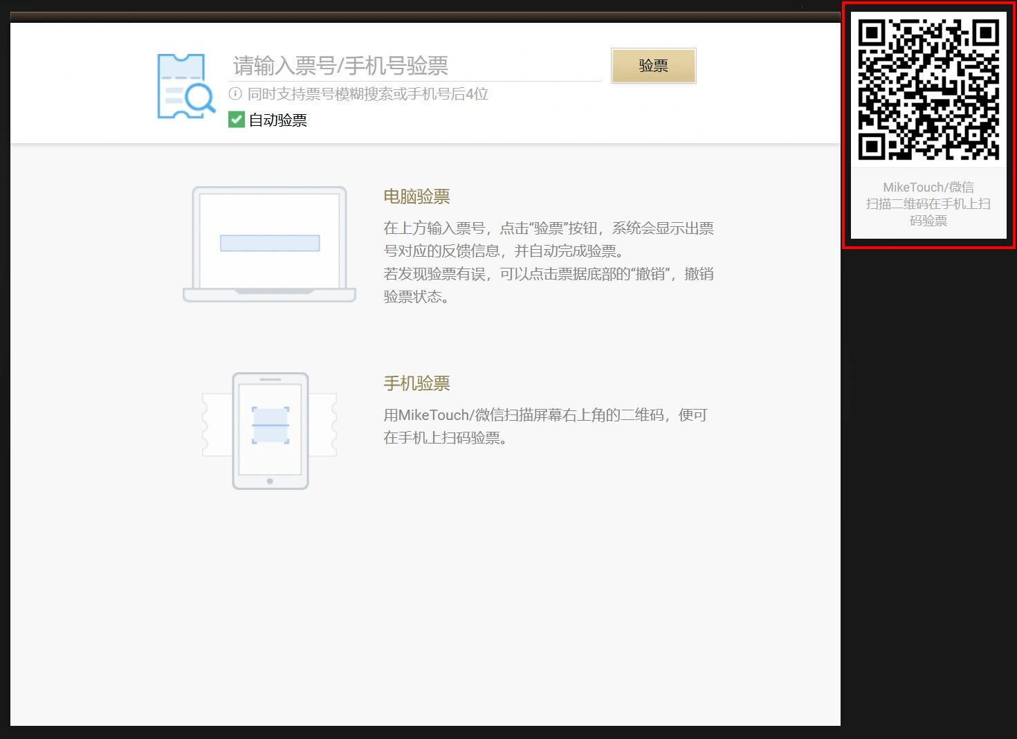 手机验票的网址链接,以二维码图片的形式,展示在右上角,使用MikeTouchAPP或微信扫描即可访问。