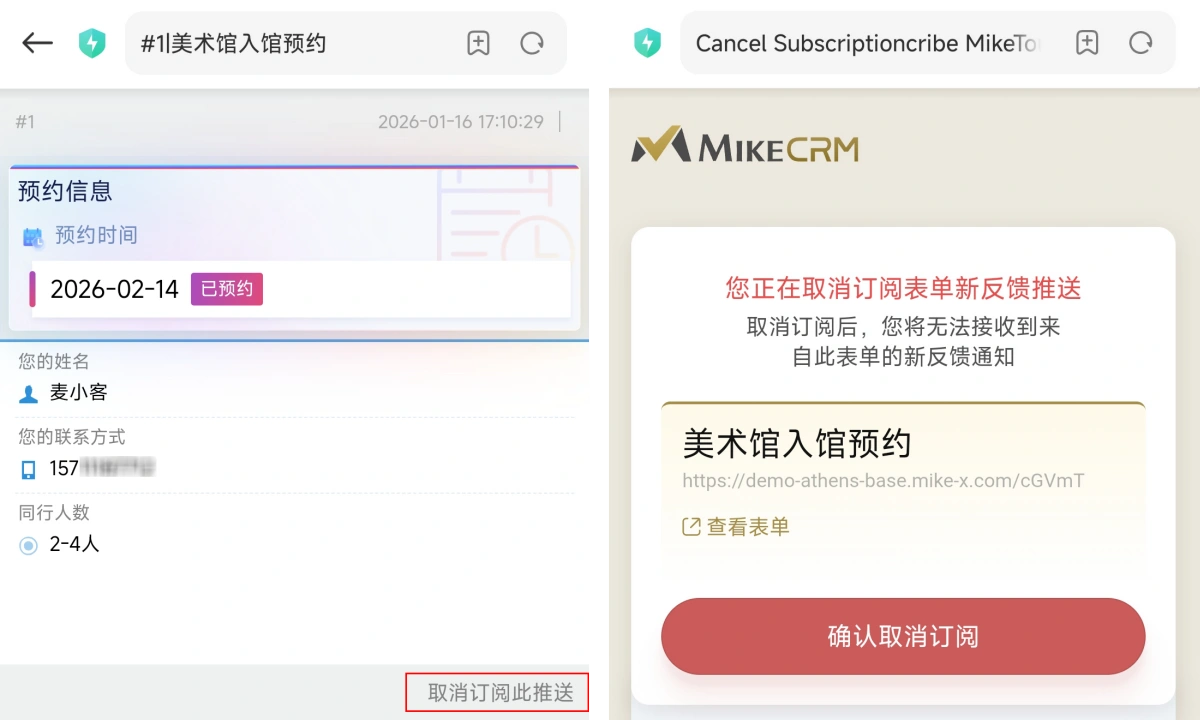 如果您不想再收到提醒消息,可以由表单管理员将您的订阅移除,也可以点击消息底部的“查看详情”后,跳转至反馈详情页面,点击页面右下角的“取消订阅此推送”,确认后自行取消订阅。