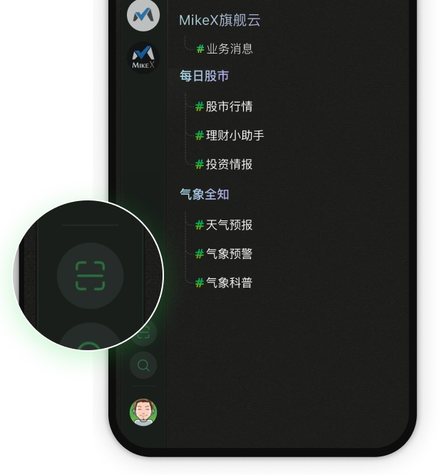进入APP主界面后,点击左下方的扫描图标,使用MikeTouch的扫码功能扫描表单制作者提供的订阅二维码,自动打开订阅页面。
