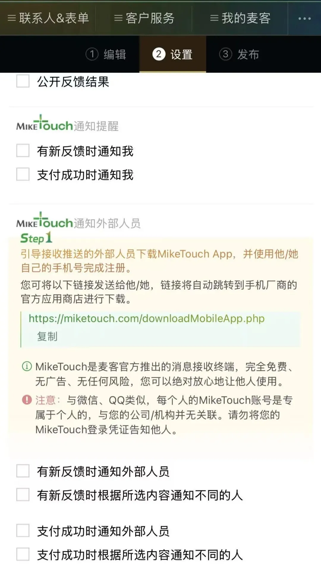 亮点:不管是在电脑网页端、MikeTouch APP端、手机浏览器端,都可以非常便捷地对表单设置MikeTouch通知提醒哦~